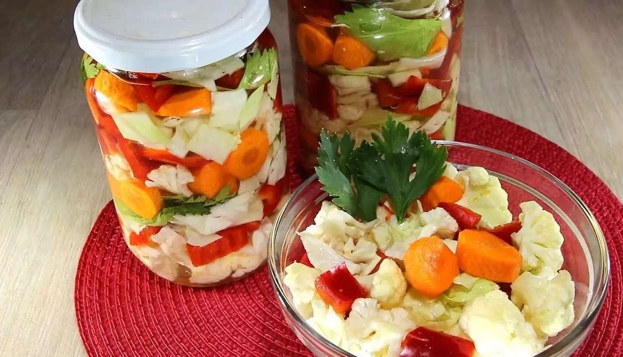 Продукти: 10 кг зеленчуци (карфиол, моркови, зелени домати, корнишони), 4 бр целина, (глави и листа), 6 – 7 глави чесън, 500 гр оцет и 500 гр сол.
