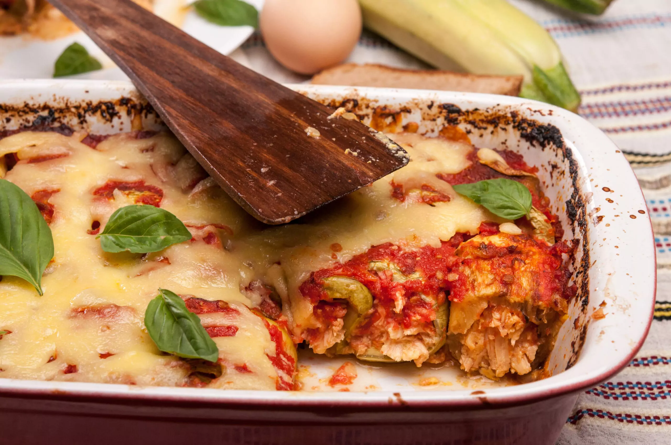 Продукти: патладжани, доматено пюре, домати, сол, черен пипер, захар, моцарела, босилек